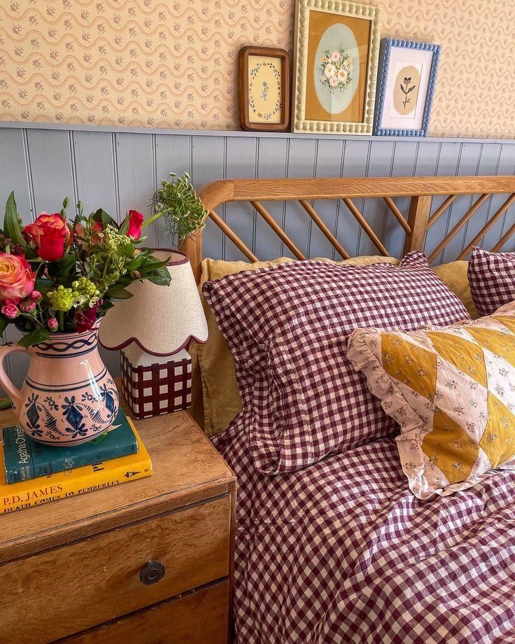 If there is one single swap that will instantly make your bedroom feel more cottagecore, it is changing your bedding to gingham or stripes. This bedroom uses a mix of burgundy and terracotta gingham and stripe patterns layered together, and the result is so warm and inviting. You do not need to match everything perfectly. Mix different check scales, throw in a patchwork accent pillow, and let it feel a little relaxed. Linen gingham in earthy tones like rust, clay, blush, or sage will give you the most authentic look, and it only gets better the more you wash it.