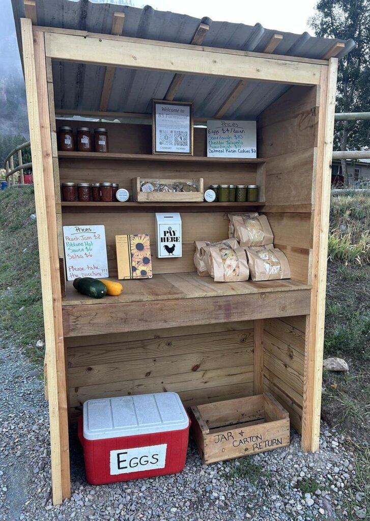 This clever cabinet-style stand is all about convenience and variety. With its bright red “Fresh Eggs & Sweets” sign, it invites people in to browse the shelves filled with baked treats, eggs, and even take-home meals. The wooden crate display adds rustic charm, while the framed payment instructions make it simple for customers to know exactly what to do. It’s a great example of mixing practicality with country style.