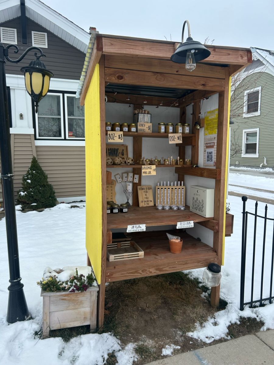 This bright yellow suburban farmstand is a great reminder that small details make a big difference, like a simple gooseneck barn light at the top, which makes the stand visible and welcoming even on dark winter afternoons. Jars of honey, beeswax lip balm, and seasonal goods are neatly labelled with handwritten price tags, and a jar return crate sits on the lower shelf. A stand like this positioned near the footpath can draw in passing pedestrians as easily as passing cars.