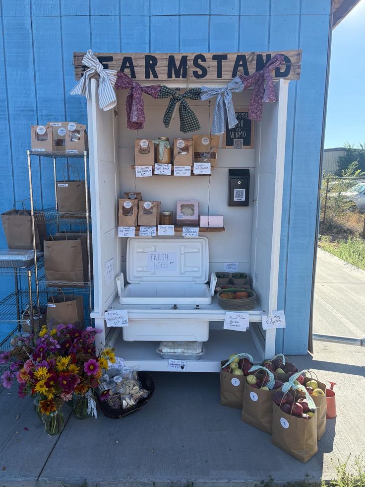 This pink-painted cabinet is proof that your farmstand doesn’t have to look like a traditional farm setup to be completely charming. The arched top, fresh coat of paint, and “Come In, We’re Open” rooster sign give it real personality, while the chalkboard menu inside lists cookies, fudge, Rice Krispies packs, and snack mixes. It’s a wonderful idea for anyone who loves to bake but doesn’t necessarily have a vegetable garden. Your stand can sell whatever you make.