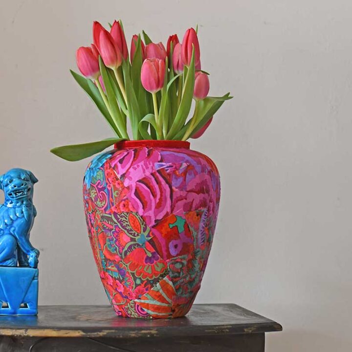 Do you have teeny tiny bits of fabric that cant be sewn? Try this no-sew decoupage vase project.