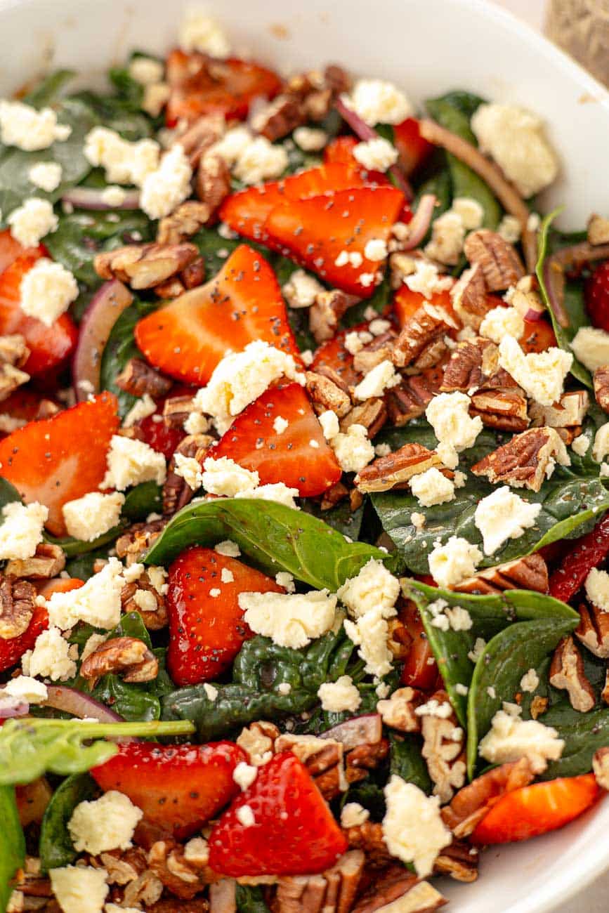 Serve the salad right away while it’s fresh and crisp. The dressing will start to soften the spinach and strawberries if it sits for too long. If you’re prepping ahead, keep all the components and dressing separate and toss just before serving.